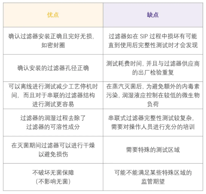 SIP后过滤器完整性测试提供了过滤器在SIP过程没有损坏的保证,但在执行SIP后使用前完整性测试时也存在一些缺点。下表总结了SIP之前或之后进行使用前完整性测试的潜在利弊。