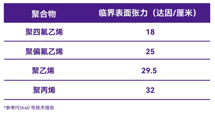一种物质的疏水性可以用液体发生自然润湿的最低表面张力来表示,称之谓临界表面张力。临界表面张力的数值见下表,在涉及的常见材料中,聚四氟乙烯的疏水性最强,聚丙烯最低。