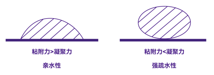 为了降低过滤组件因水汽在过滤器内积聚而堵塞的风险,特别是积聚在滤膜孔结构内部,结构材料应当为疏水性。疏水性反映了材料表面能量与液体内聚能之间的关系。水通常是参照液体,其表面张力为72达因/厘米。如下图所示,如果内聚能超过粘附力,水就成“水珠”状,而不会发生自然润湿。