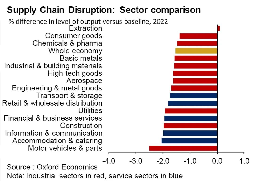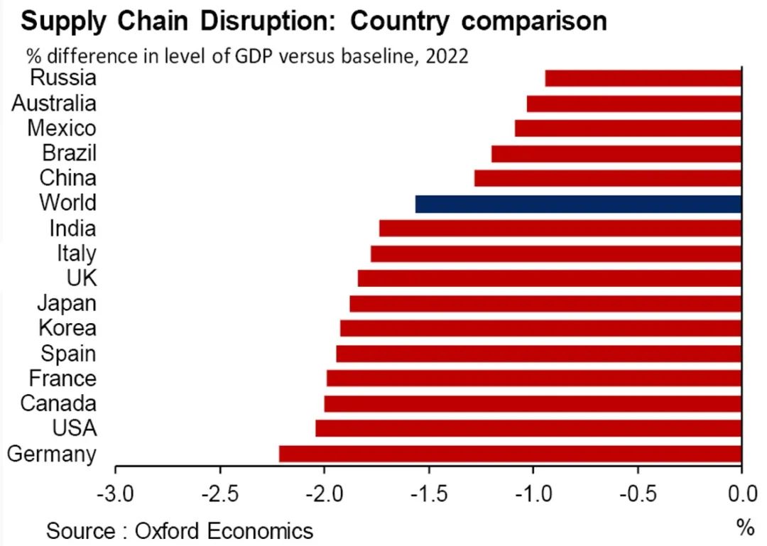 , from Oxford Economics's 2021 model forecast, the overall impact of the supply chain crisis on developed countries in Europe and the United States is greater, above 2% (here 2% is not a GDP percentage but an absolute value), that is, assuming the normal GDP growth rate of the United States in 2022 is 4%, the supply chain crisis will cause the GDP growth rate of the United States to drop to 2% in 2022.